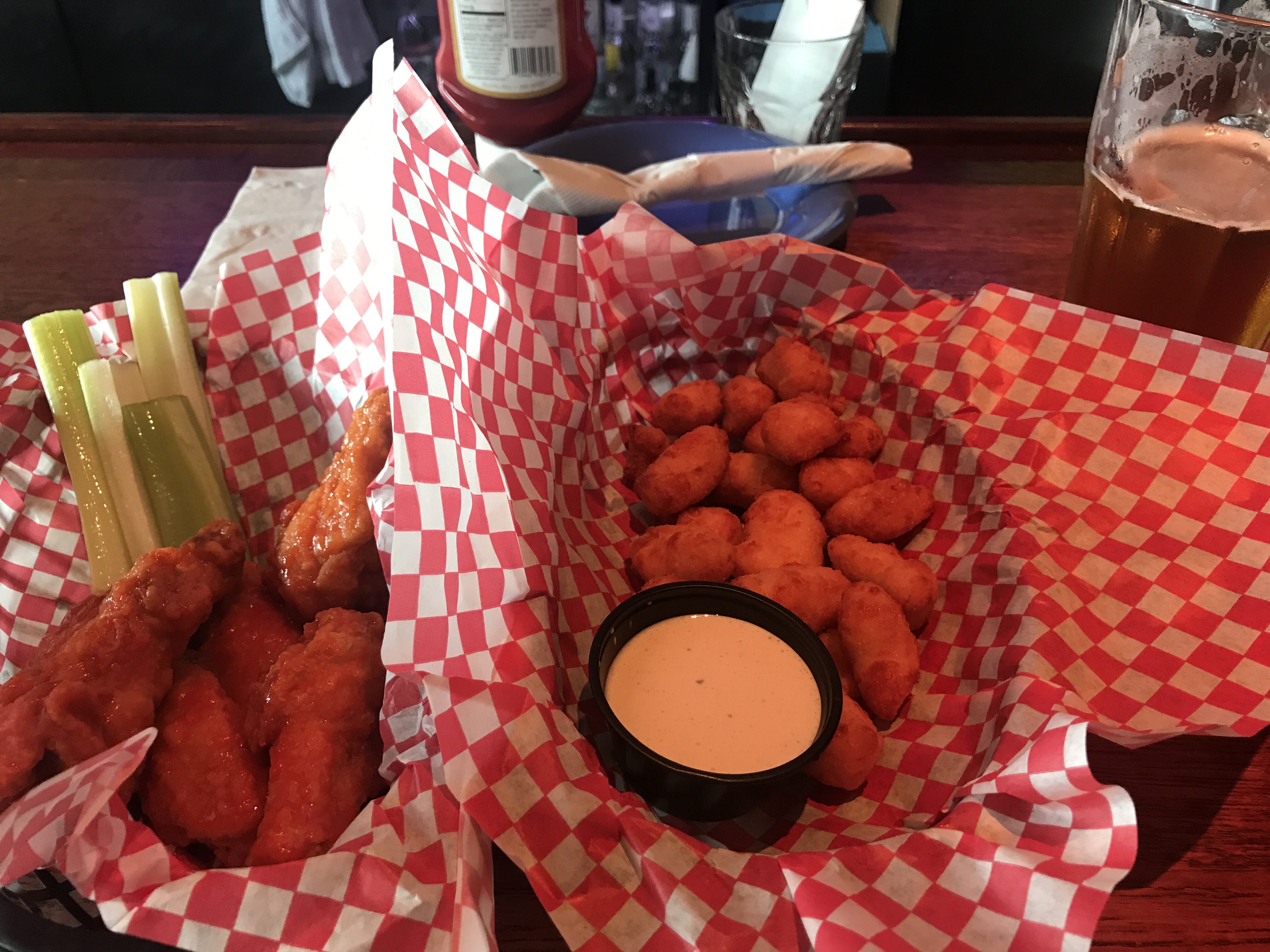 Hot wings, cheese curds and beer. Ok, so maybe cheese curds are more appropriate to Wisconsin than Minnesota but truth be told, if I step out the door of this bar and look right, I can see Wisconsin