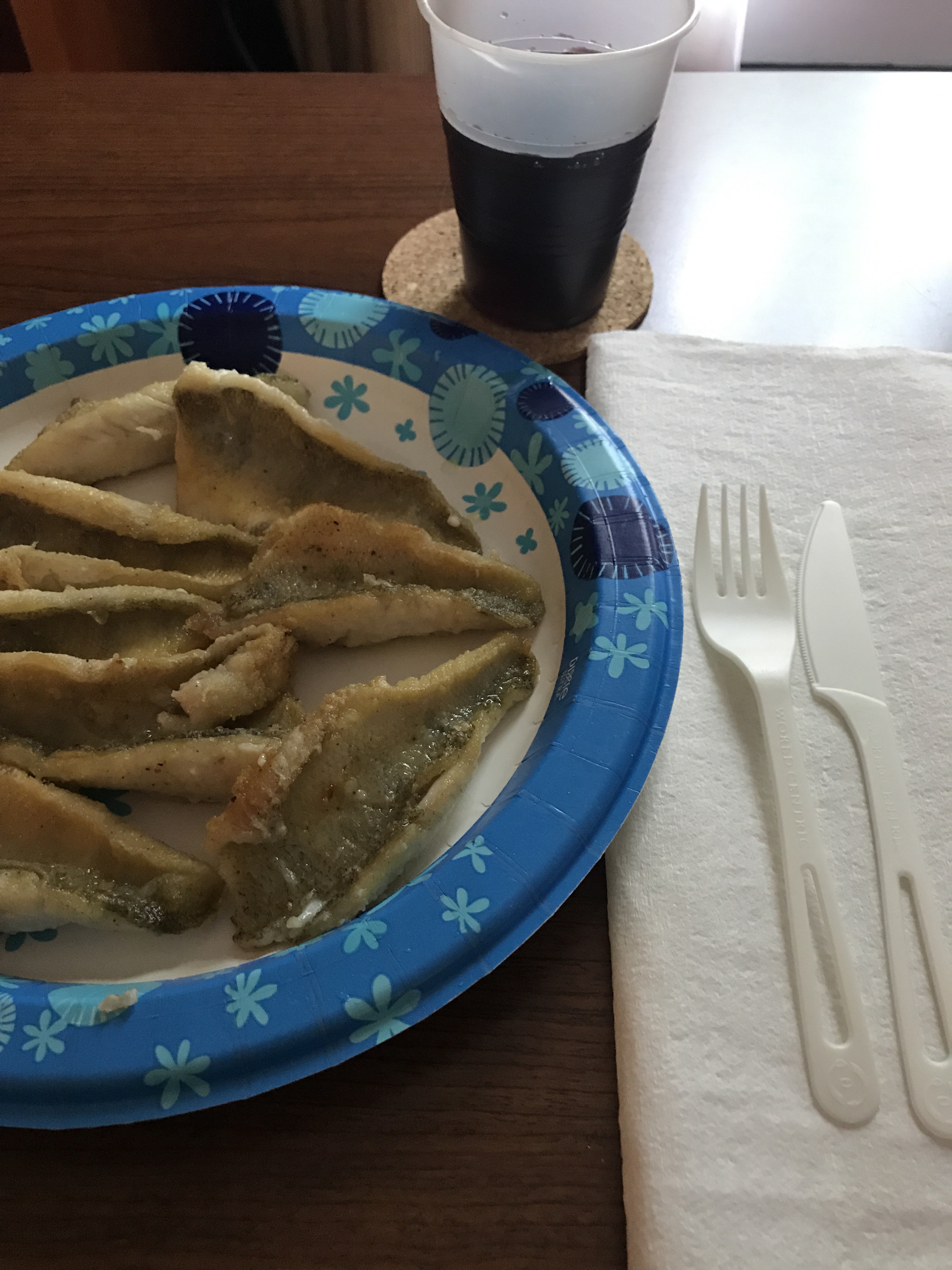 Home cooked meal. Well ok, a hotel cooked meal – paper plate, plastic utensils and a plastic wine glass (yes, red wine with fish). But, after nine weeks of restaurant food, it was fantastic!