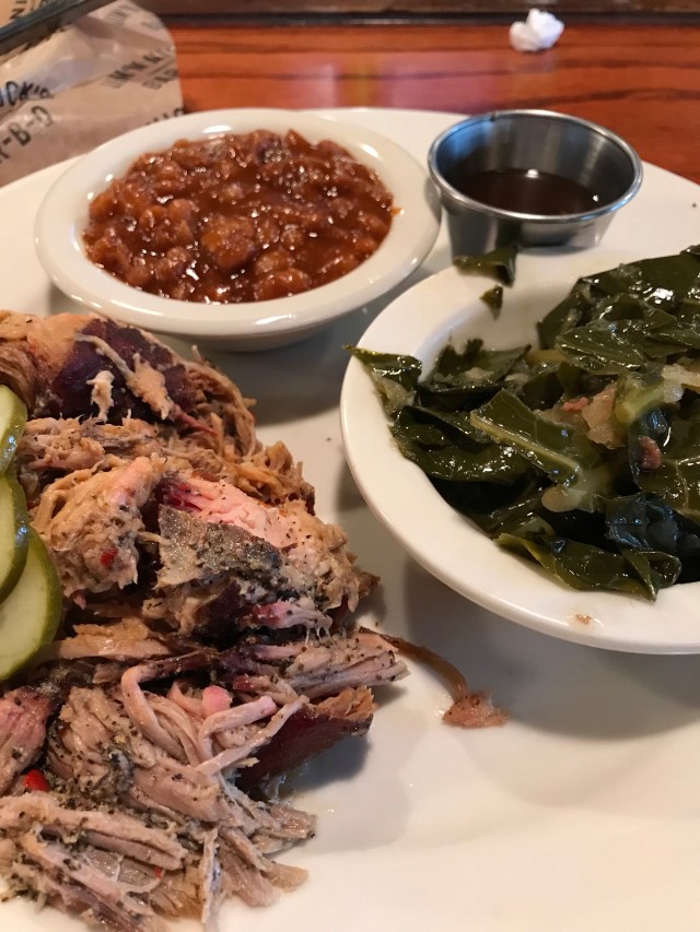 Continuing to eat BBQ while in the south. Today, North Carolina pulled pork (with spicy vinegar), collards, baked beans and cornbread muffins 😋