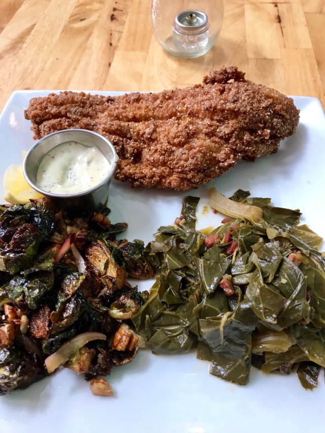 Classic southern lunch – fried catfish, collards and Brussels sprouts 😋