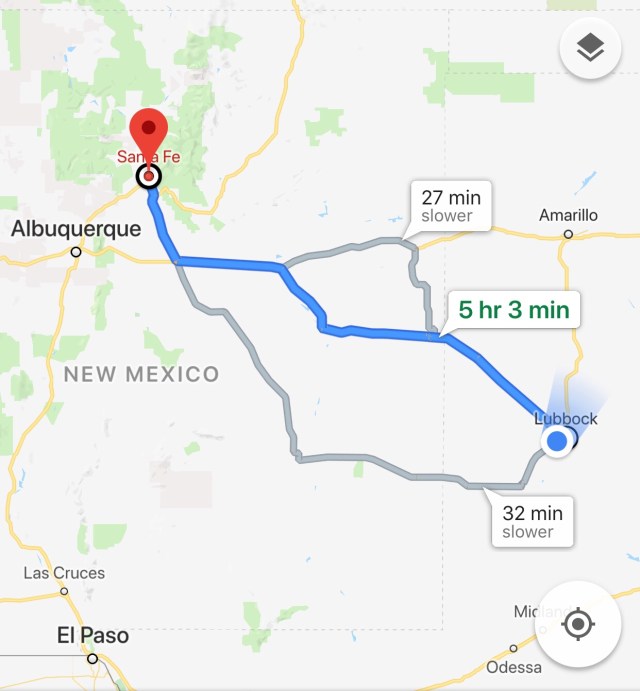 From Lubbock, Texas to Santa Fe, New Mexico. I’ll spend three nights in Santa Fe with a probable day trip to Taos on of my two days there.